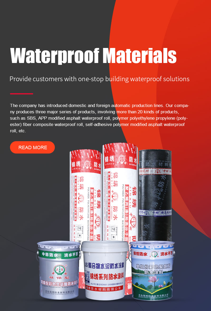 The company has introduced domestic and foreign automatic production lines. Our company produces three major series of products, involving more than 20 kinds of products, such as SBS, APP modified asphalt waterproof roll, polymer polyethylene propylene (polyester) fiber composite waterproof roll, self-adhesive polymer modified asphalt waterproof roll, pre-paving/wet paving use quick reaction strong self-adhesive composite film waterproof roll, planted roof use root penetration resistant waterproof roll, polyurethane waterproof paint, polymer cement crystalline waterproof paint, non-curing rubber asphalt waterproof coating, etc.